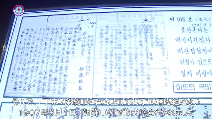 「日本は朝鮮と交戦状態にあったのでもなく、朝鮮は敗戦国でもありませんでした。しかし、日帝は形ばかりの朝鮮軍まで強制解散させました。この1つの事実を通しても、日帝は最も暴虐非道で厚顔無恥な強盗集団であり、朝鮮民族の宿敵であることがはっきり分かります」
