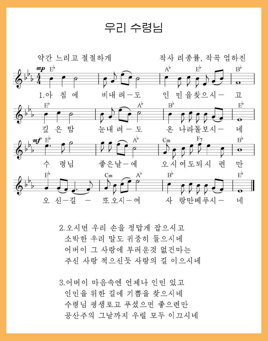 以民為天、人民を天のごとくみなすのを座右の銘として、一生、人民のために献身的に尽くすことに喜びと幸せを見出した金日成主席の熱い思いやりと、主席に対する朝鮮人民の限りない敬慕の念を意味の深いポピュラーな詩語と切々としたメロディーで表しているのがこの歌です。