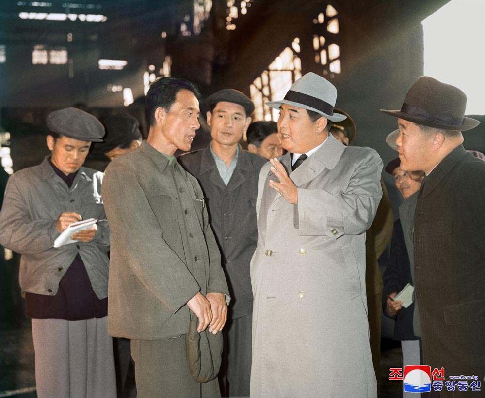 数十年前のある日、主席はピョンアン南道*1オンチョン郡*2に新しくできた干拓地の平野を訪れました。主席はまっすぐ現場へ赴きましたが、干拓地の入り口の所から車が進めなくなりました。車から降りて険しい道を先頭で歩いていく主席に随行の人たちがもうこれ以上行けませんと切に言いました。