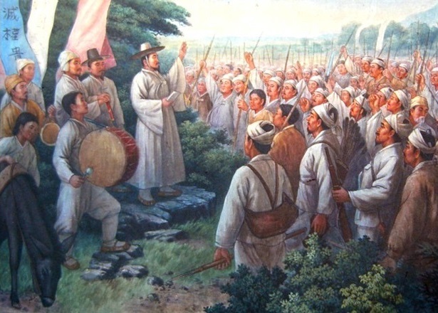 1894年2月、チョン・ボンジュンの指揮の下にチョンラ道のコブ地方の農民は灌漑用水に対する不当な税金徴収に反発して暴動を起こしましたが、これは全国を揺さぶる大規模な農民戦争に拡大しました。隊伍を整った農民軍は、チョンラ道の道都チョンジュにまで進出して、官軍を打ち破り、大勝利を収めました。