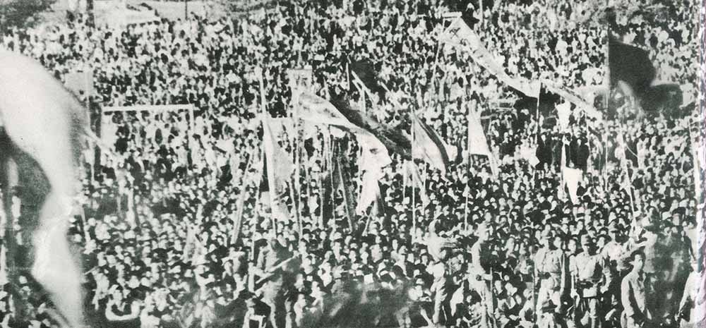 チュチェ34(1945)年10月14日、ピョンヤンのモラン峰*1の麓にある公設運動場では主席の凱旋を歓迎する市民大会が盛大に開かれました。人民は、演壇に立った主席を仰いで熱い涙を流しました。