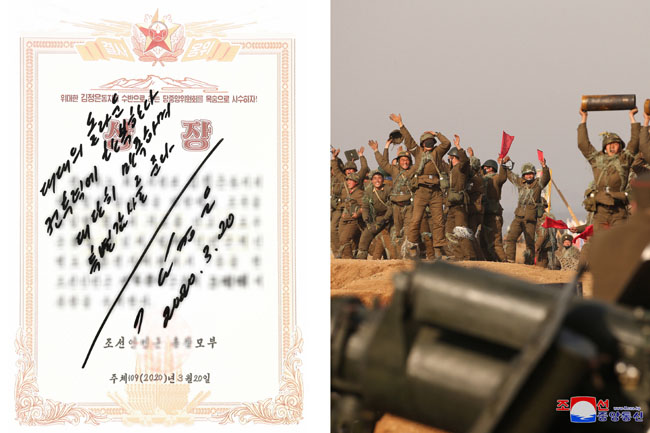 金正恩委員長は、第3軍団の臨戦態勢にすこぶる満足し、射撃競技で驚異的な射撃術を見せて桁外れの成績を受けた第3軍団管下の砲兵大隊に授けられる名砲手賞状に、「大隊の驚くべき戦闘力に感服する。とても満足し、特別感謝を与える。金正恩。2020年3月20日」と言う意義深い祝いの直筆を書き留めました。