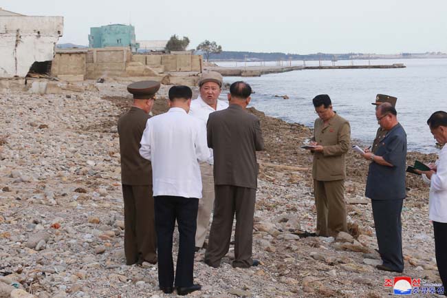 9月5日、台風に見舞われたハムギョン南道の被災地に着いた敬愛する最高指導者金正恩委員長は、党中央委員会副委員長たちから現地で把握した台風の被害状況について詳細に聞きました。