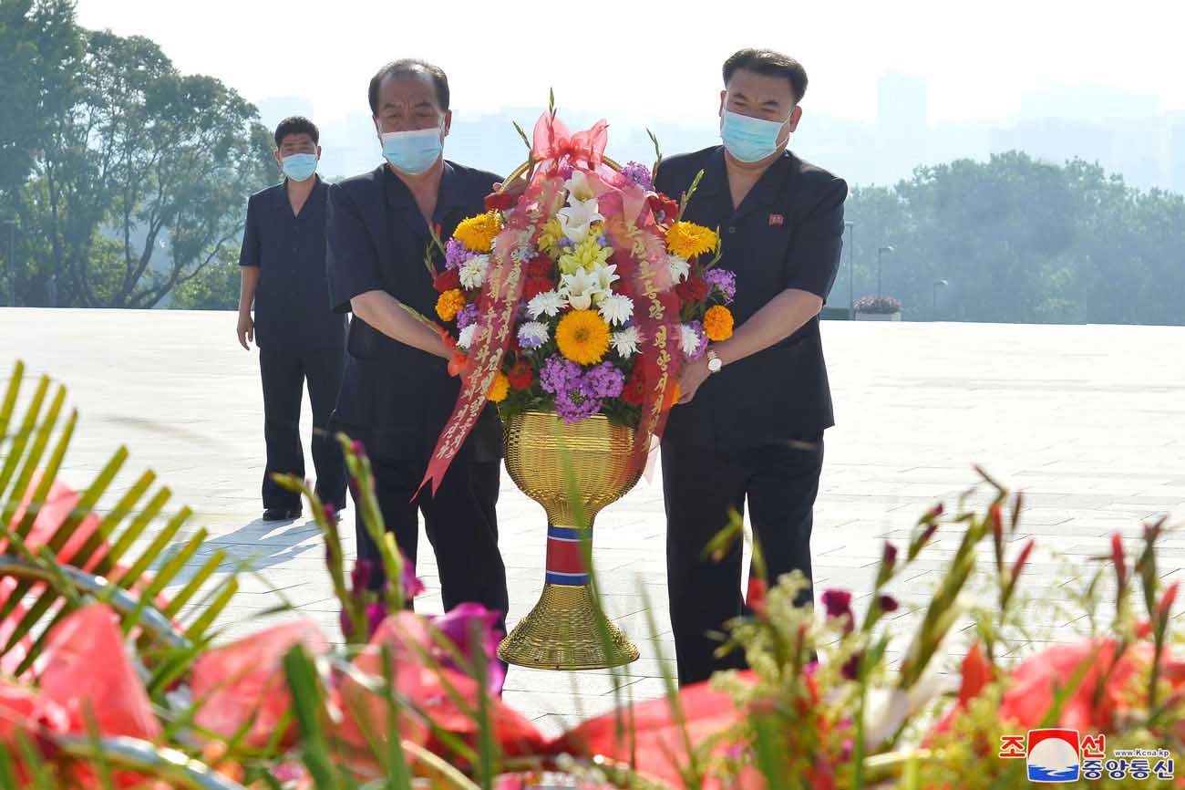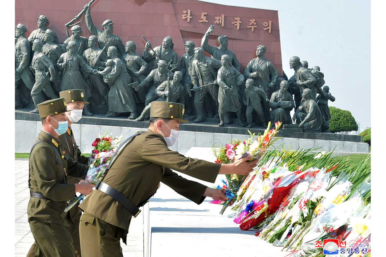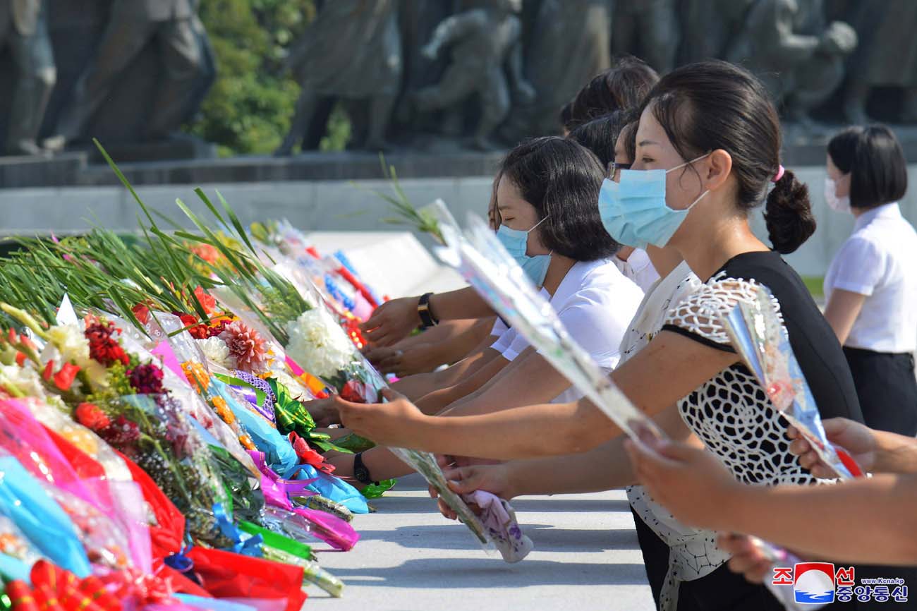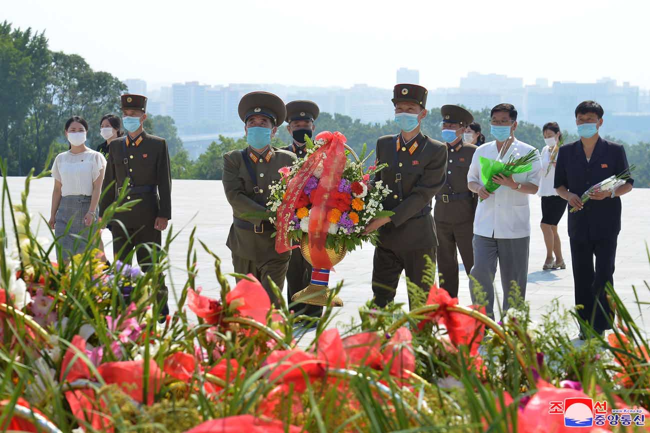 マンスデの丘の主席と総書記の銅像に、党、政権、武力機関、大衆団体、各省、中央機関、朝鮮人民軍と社会安全軍の各部隊、ピョンヤン市内の各機関、企業、工場、大学、学校などの名義の花かごが捧げられました。