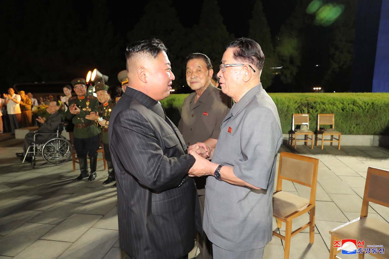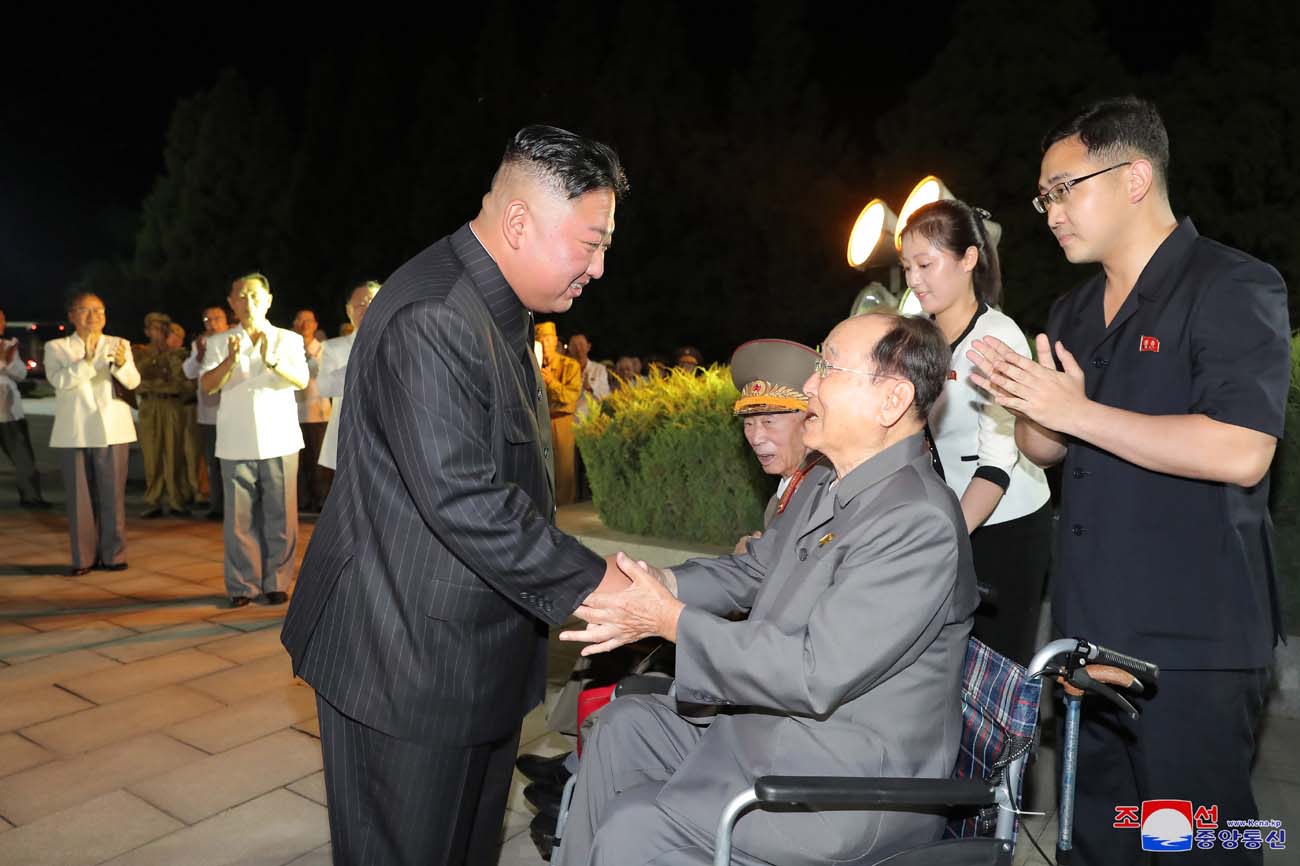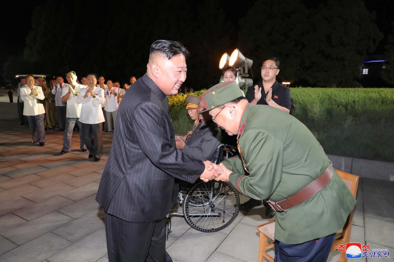 金正恩総書記は参戦老兵と共に華々しい夜景の中に輝く「勝利」像を眺め、7月27日が持たせた偉大な精神と意志が社会主義建設の進展を促す永遠の推進力になるものとの確信を表しました。