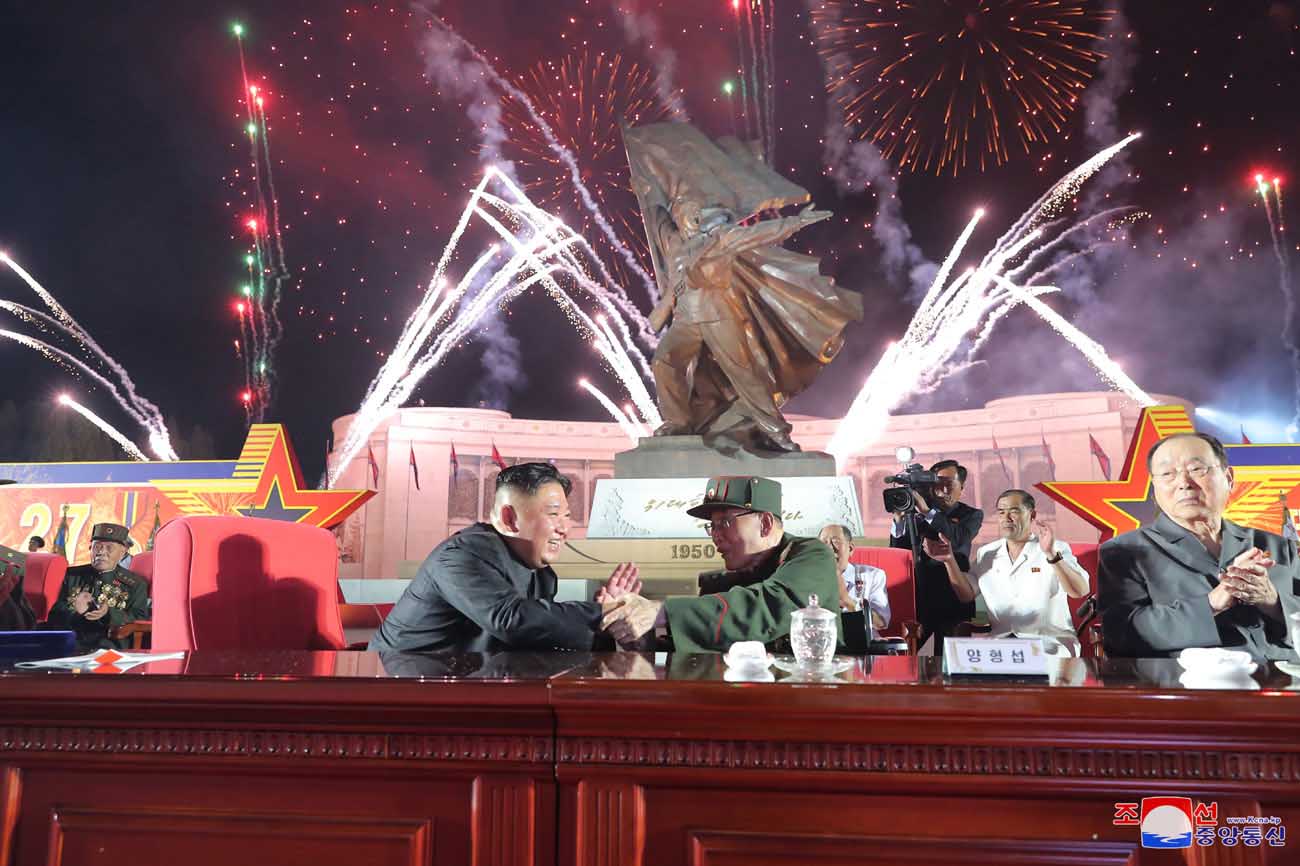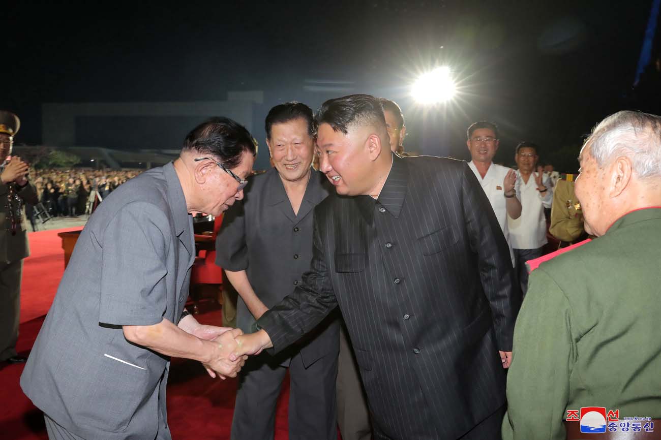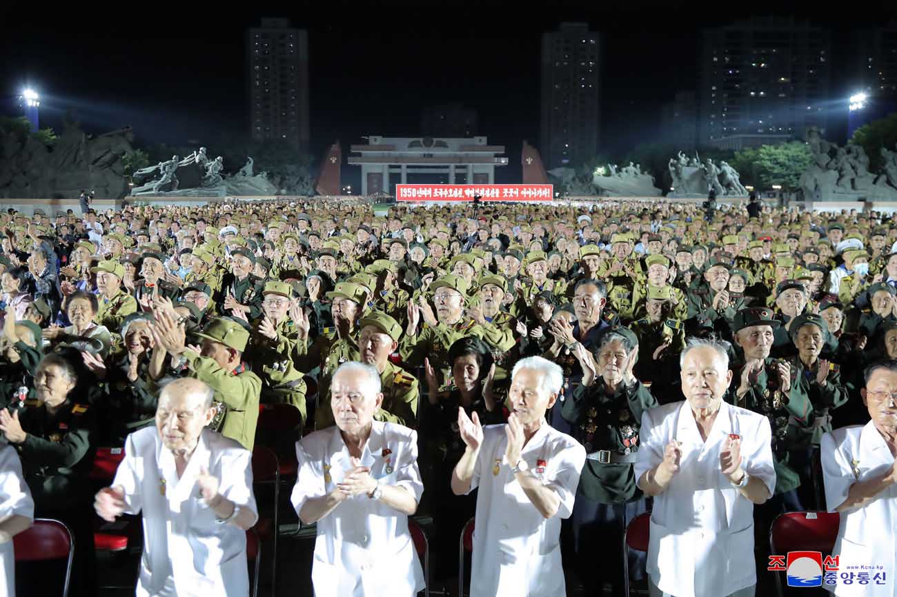 金正恩総書記は参戦老兵と共に華々しい夜景の中に輝く「勝利」像を眺め、7月27日が持たせた偉大な精神と意志が社会主義建設の進展を促す永遠の推進力になるものとの確信を表しました。