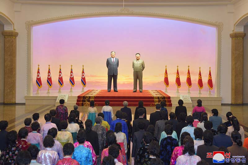 主席と国防委員長が生前の姿に安置されているホールで最も敬虔な気持ちで永生祈願の挨拶を捧げました。