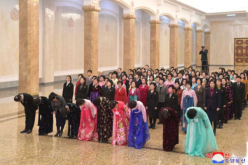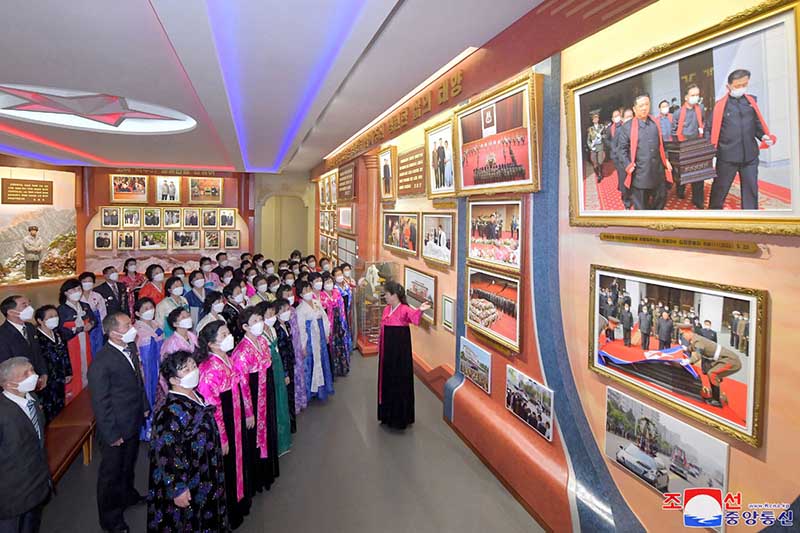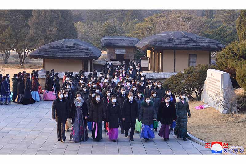 一行は偉大な金日成主席と偉大な金正日国防委員長が生前の姿におられるチュチェの最高聖地クムスサン太陽宮殿を訪れ、崇高な敬意を表しました。