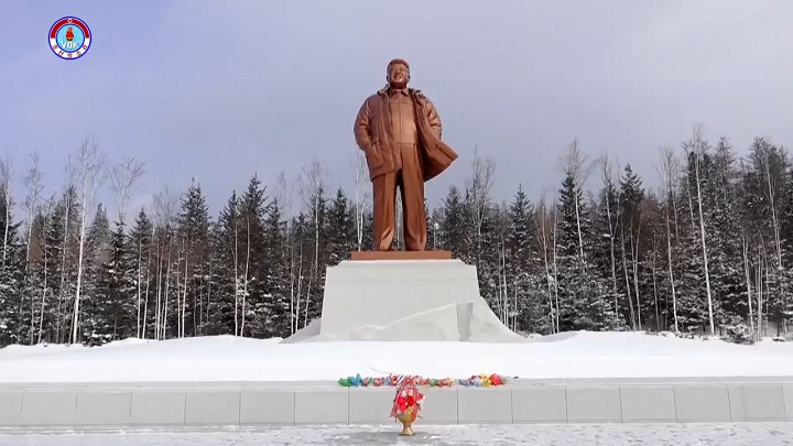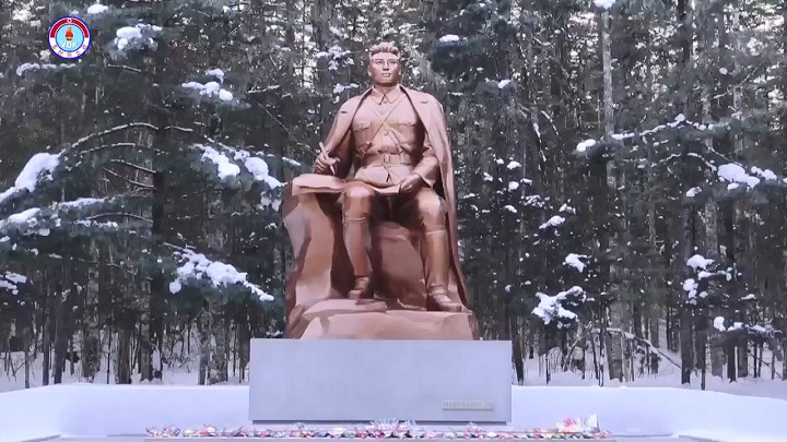 チョン峰宿営地に着いた一行は宿営地にある偉大な金日成主席の銅像に花束を捧げ敬意を表しました。