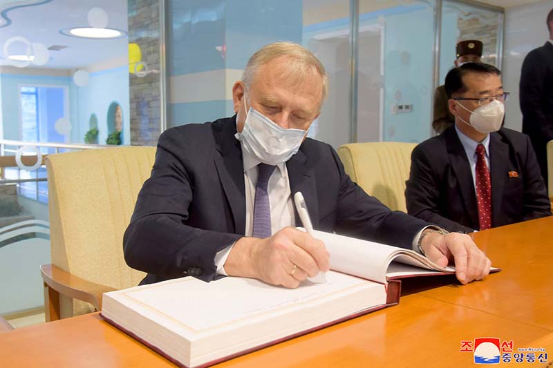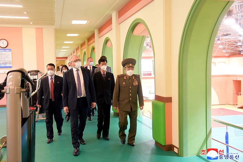 大使館の人たちは、朝鮮労働党の導きの下に学院が革命人材育成の原種場となり、革命家の遺児たちがチュチェの革命のバトンをしっかり受け継いでいる真の継承者、核心に育っていることについての解説を聞き、各講義室と総合体育館、プールを見ました。