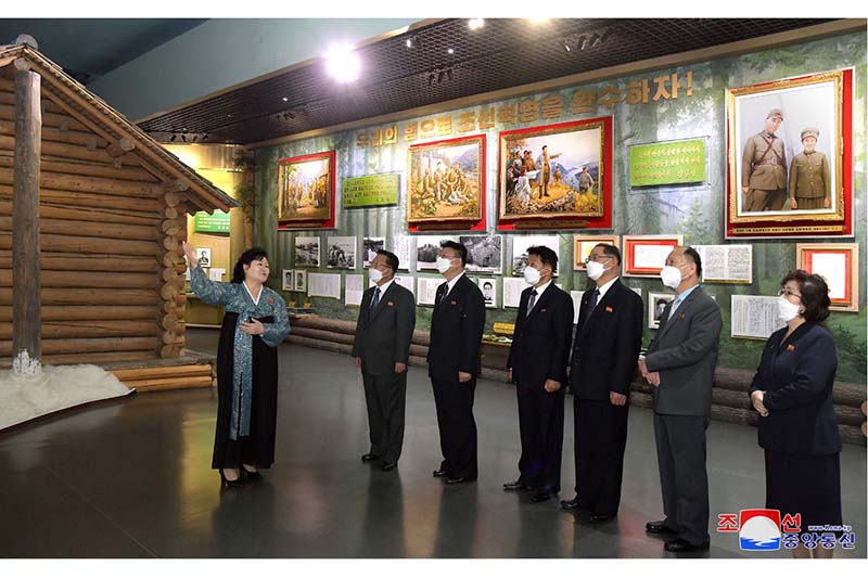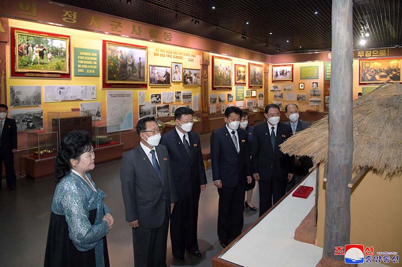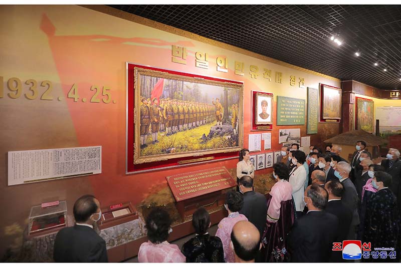 抗日革命闘争時期館の各エリアで一行は、厳しい抗日大戦を輝かしい勝利へと導いて国の解放の歴史的偉業を成し遂げた偉大な金日成主席の不滅の業績についての解説を聞き、写真と物件資料に見入りました。