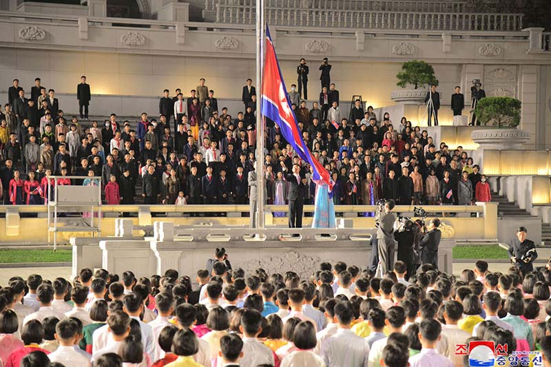 朝鮮民主主義人民共和国の国歌が厳かに響く中、労働者と農民、知識人が国旗を掲揚しました。