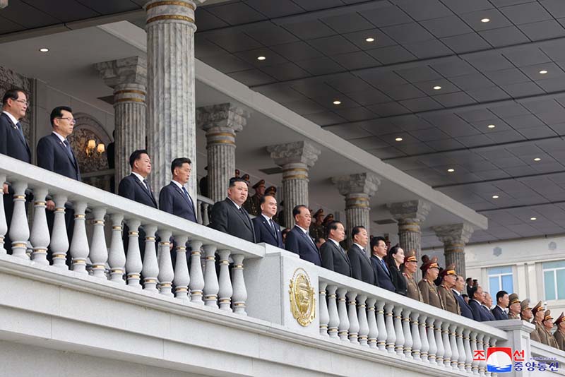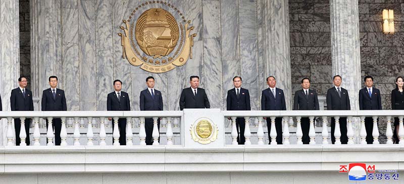 朝鮮労働党中央委員会政治局常務委員会委員のキム・ドクフン、チョ・ヨンウォン、チェ・リョンヘ、リ・ビョンチョルの各氏をはじめとする党と政府、軍部の幹部、内閣、勤労者団体、各省、中央機関の責任幹部、功労者が幹部壇につきました。