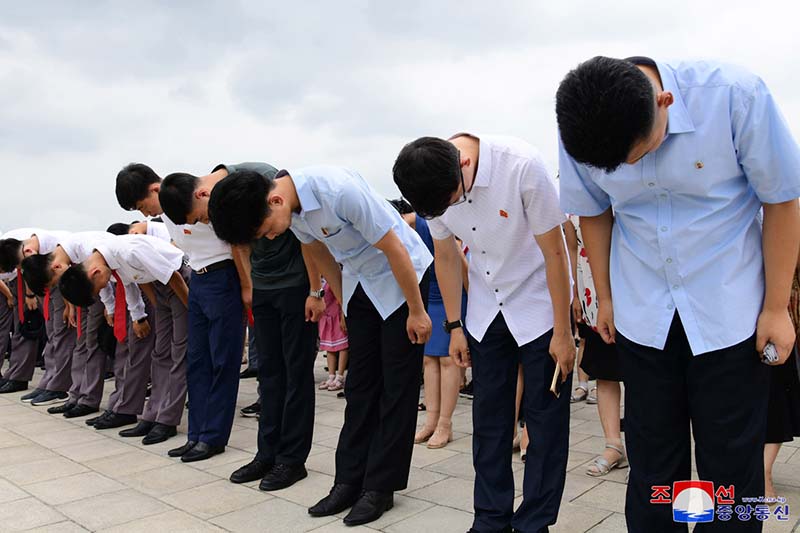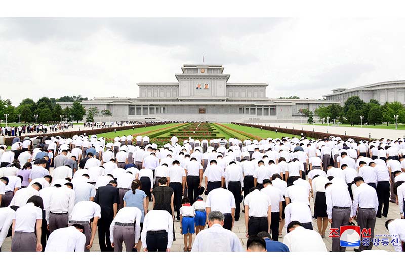 民族最大の追悼の日に際して多くの勤労者と人民軍軍人、青少年が金日成主席と金正日国防委員長が生前の姿で安置されているクムスサン太陽宮殿を訪れ、最も崇高な敬意を表しました。