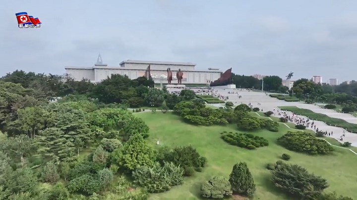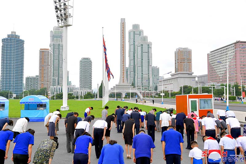 金日成主席が生前の姿で安置されたクムスサン太陽宮殿とピョンヤンの方に向けて人民みなと人民軍軍人、青少年が最も敬虔な追悼の気持ちで3分間、黙祷を捧げました。