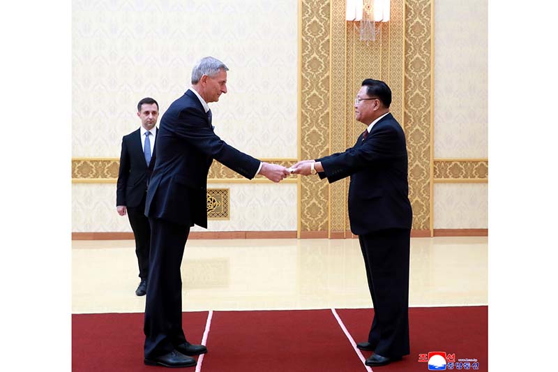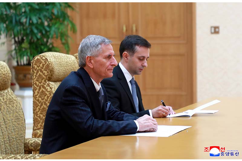 23日、マンスデ議事堂で、朝鮮民主主義人民共和国国務委員長の委任により、国務委員会第1副委員長の最高人民会議常任委員会チェ・リョンヘ委員長にアンドレイ・テホフ特命全権大使から信任状が手渡されました。