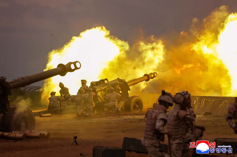 最精鋭革命強兵の戦闘的威力を万般にわたって一層固めるための強力な訓練熱風が全軍に巻き起こっている中、7月23日、朝鮮人民軍大連合部隊砲兵区分隊間の射撃訓練競技が行われた。
