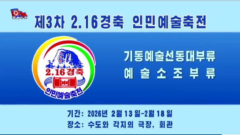 祭典は芸能宣伝隊と芸術サークルの2部類に分けて、2月13日から18日にかけて平壌と各地の劇場と会館で行なわれます。